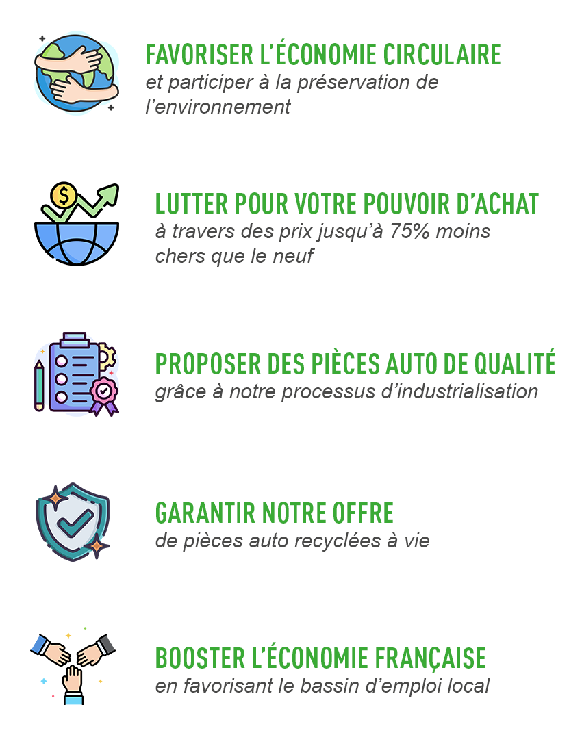 Chez Back2car, notre métier de recycleur automobile repose sur des principes solides de recyclage automobile et d’économie circulaire auto. Nous nous engageons à transformer les véhicules hors d’usage en pièces auto d’occasion recyclées de haute qualité, contribuant ainsi à la préservation de l’environnement et à la réduction des déchets.